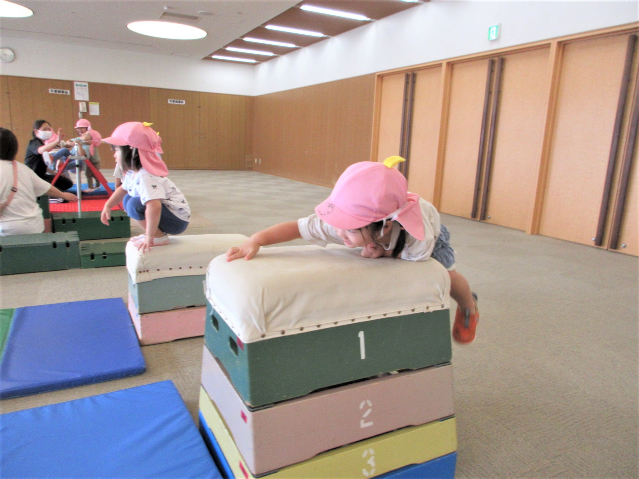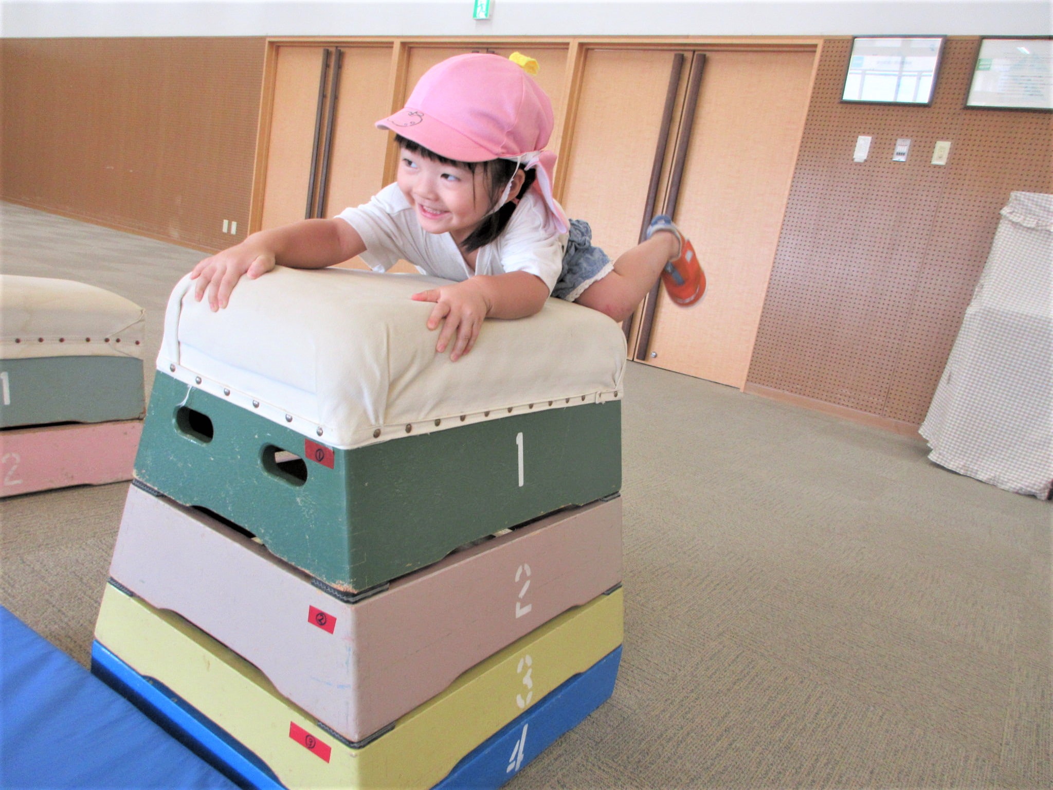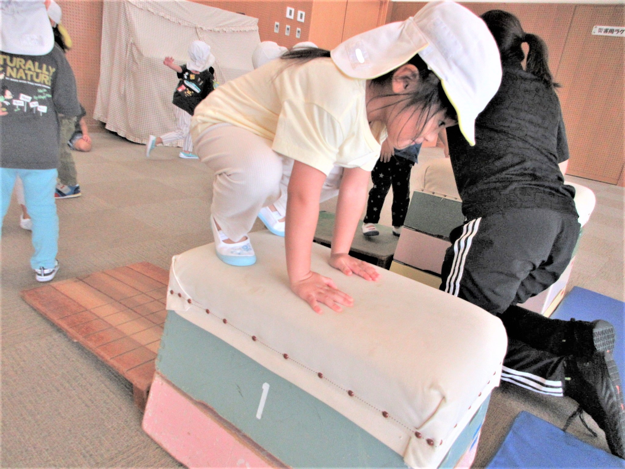 試行錯誤を重ねながら、4段の跳び箱をよじ登る子どもたち・・・