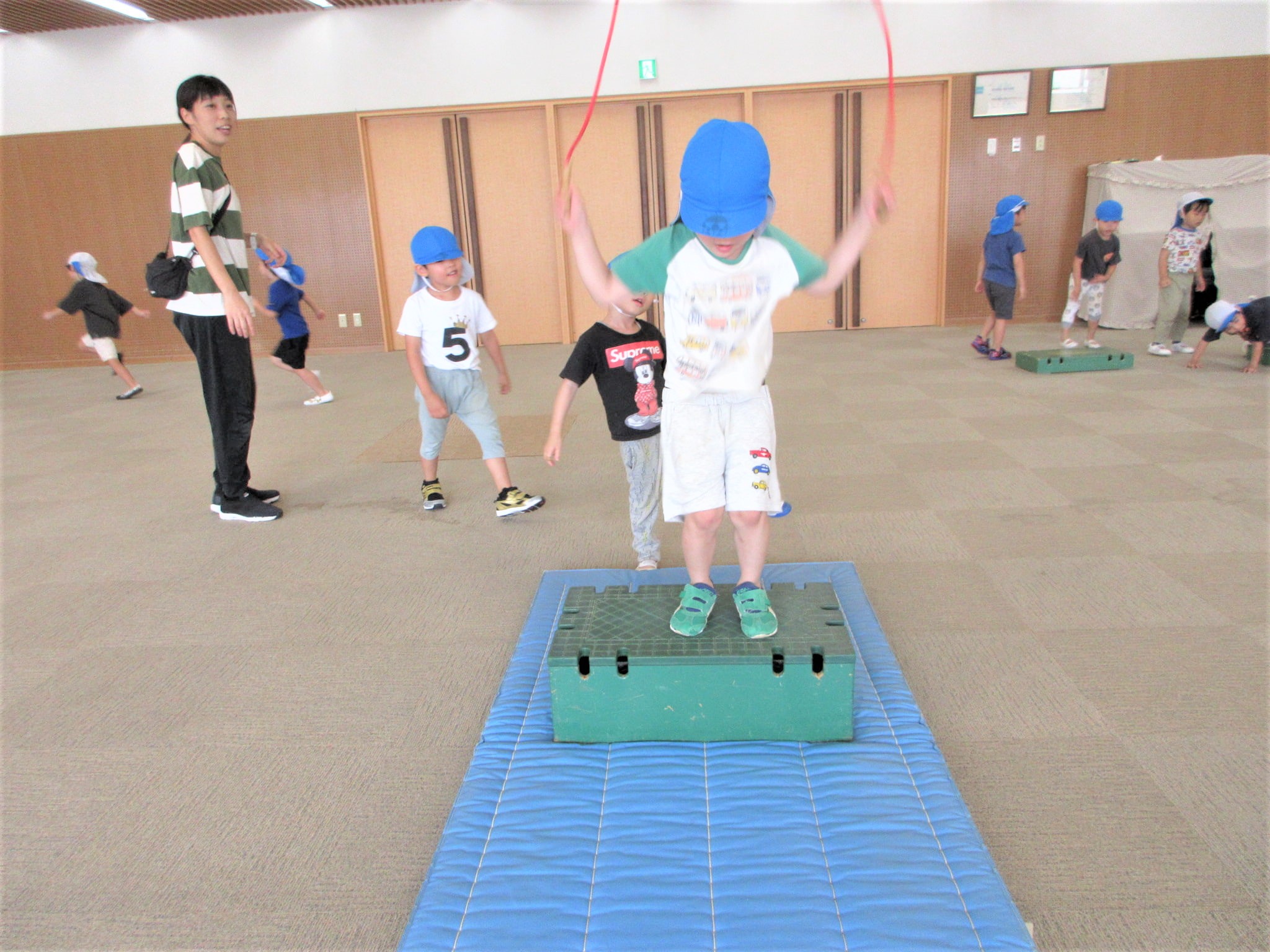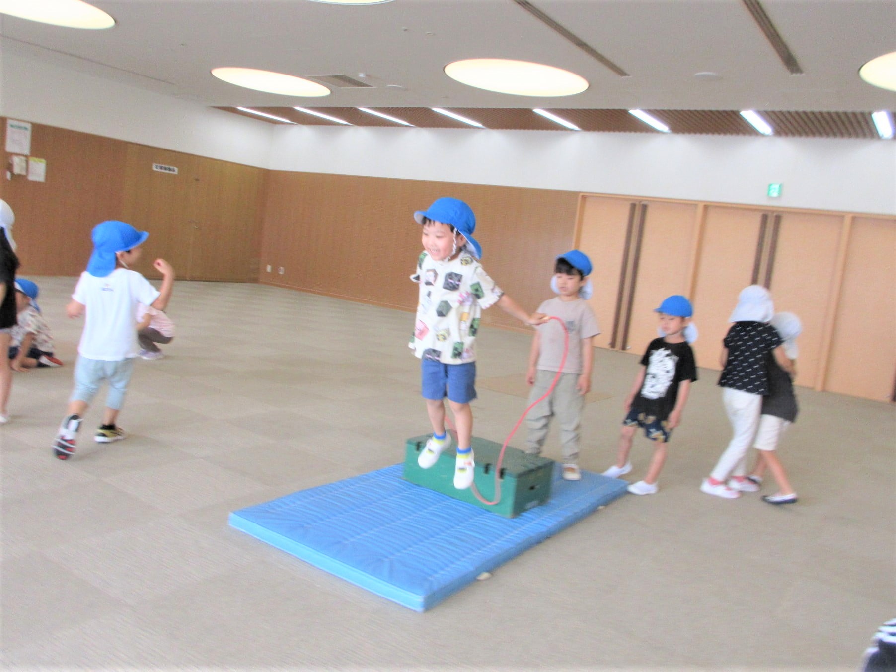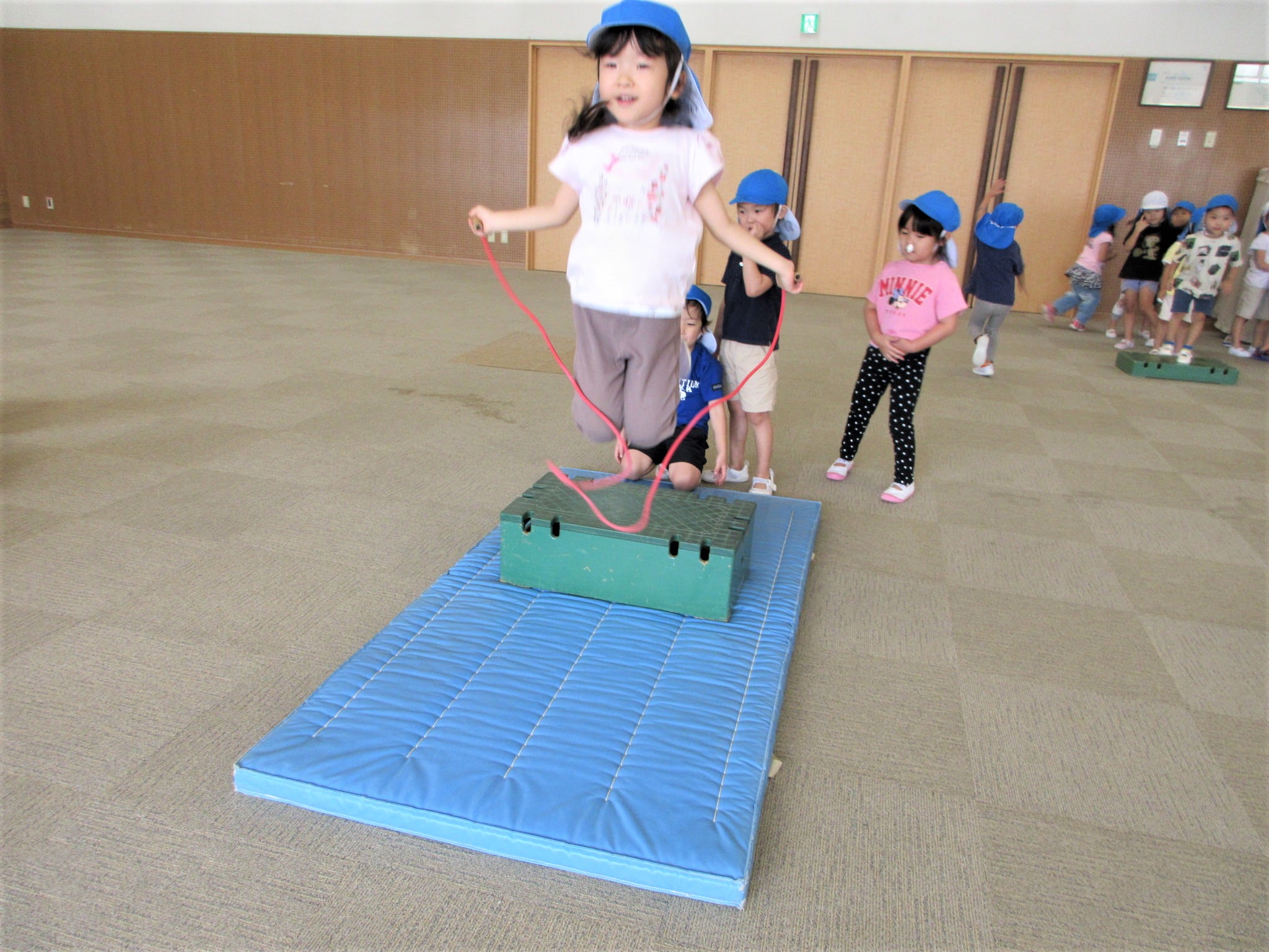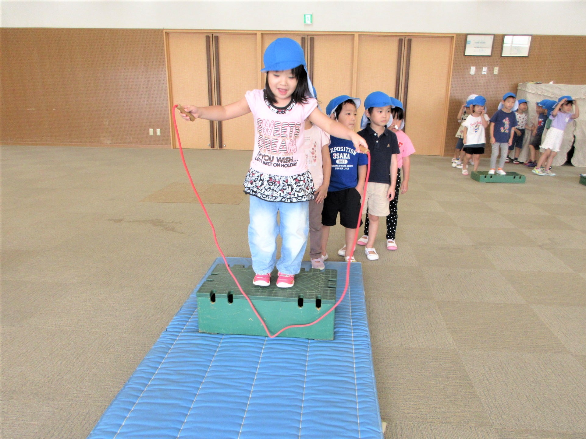 縄跳びを前に振り下ろして、巧技台の上からジャンプ!!