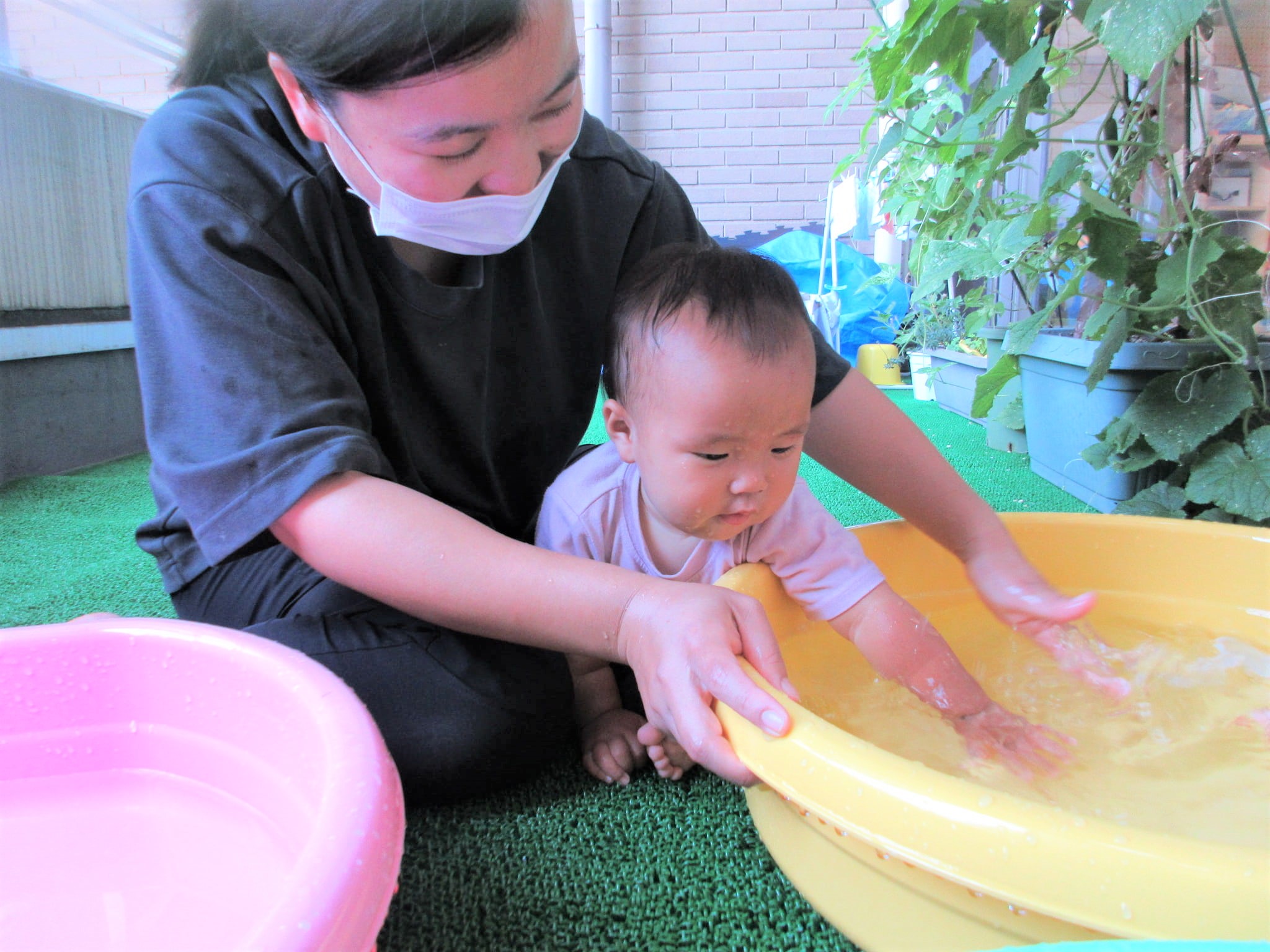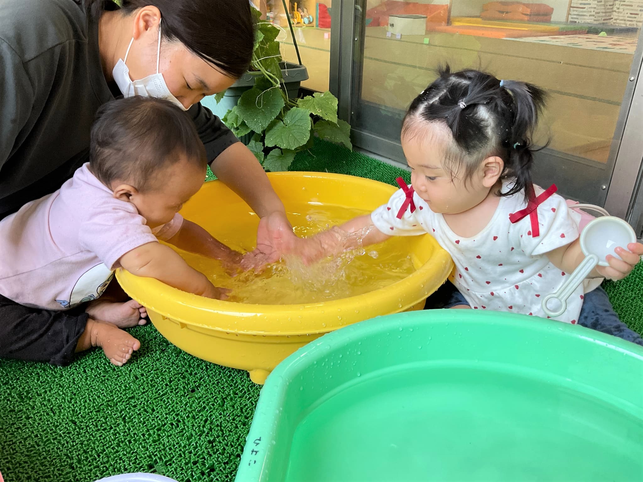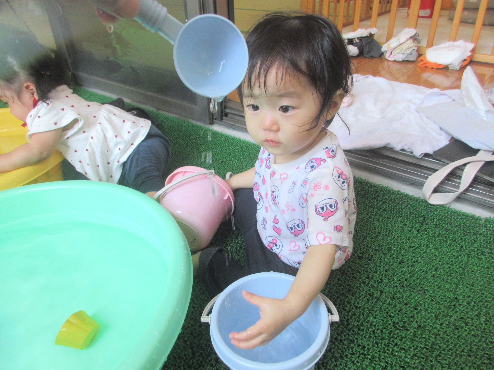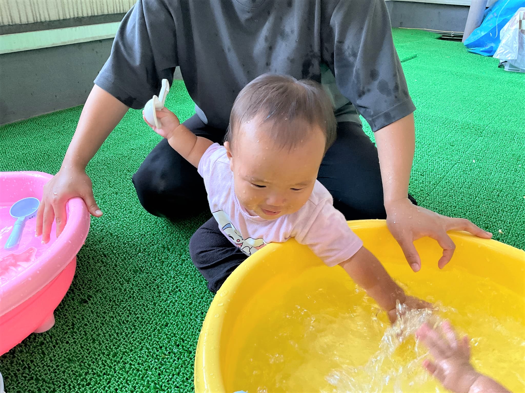 そこから、ひよこ組の部屋をふと見ると、水遊びをしていたので