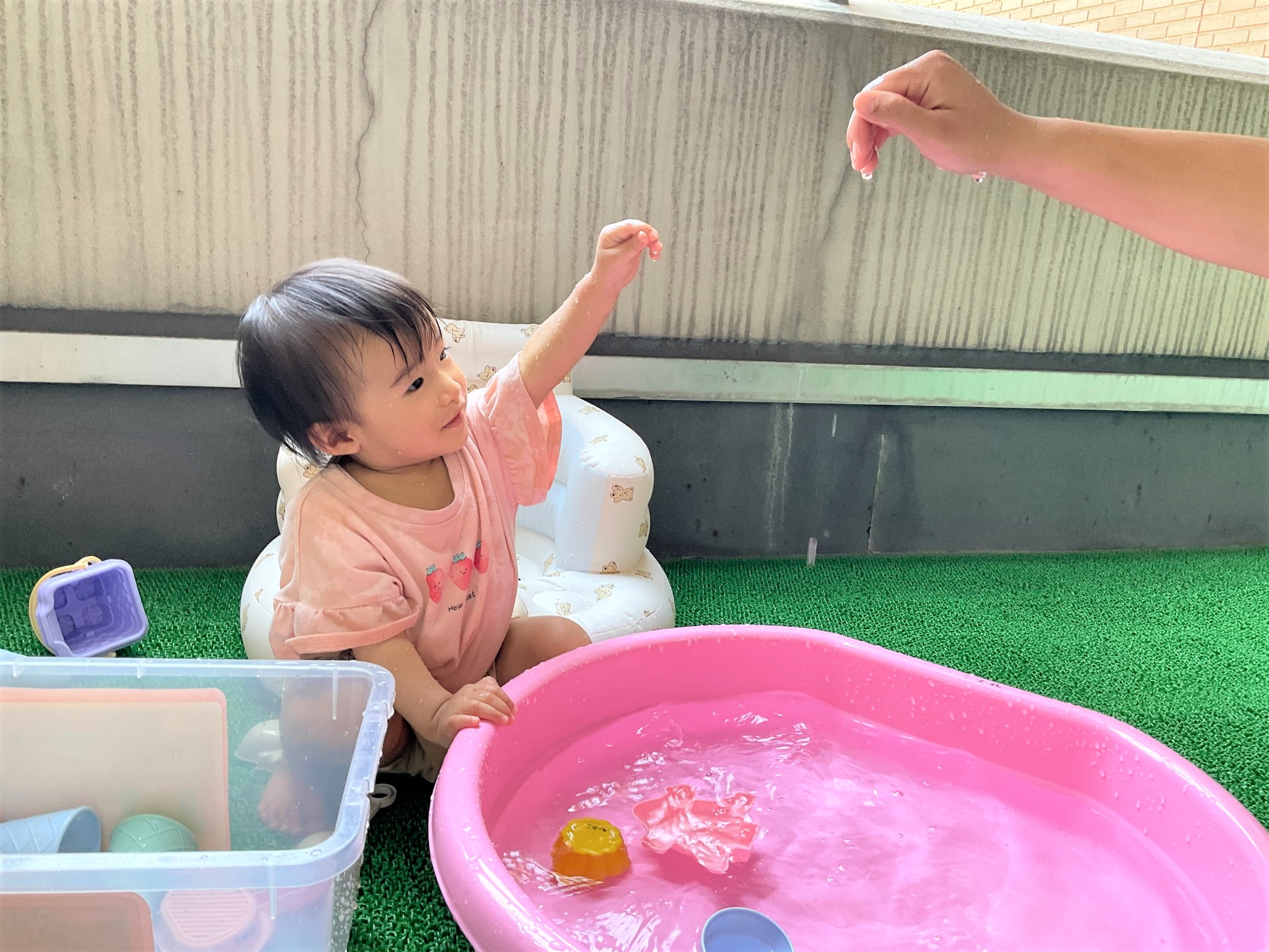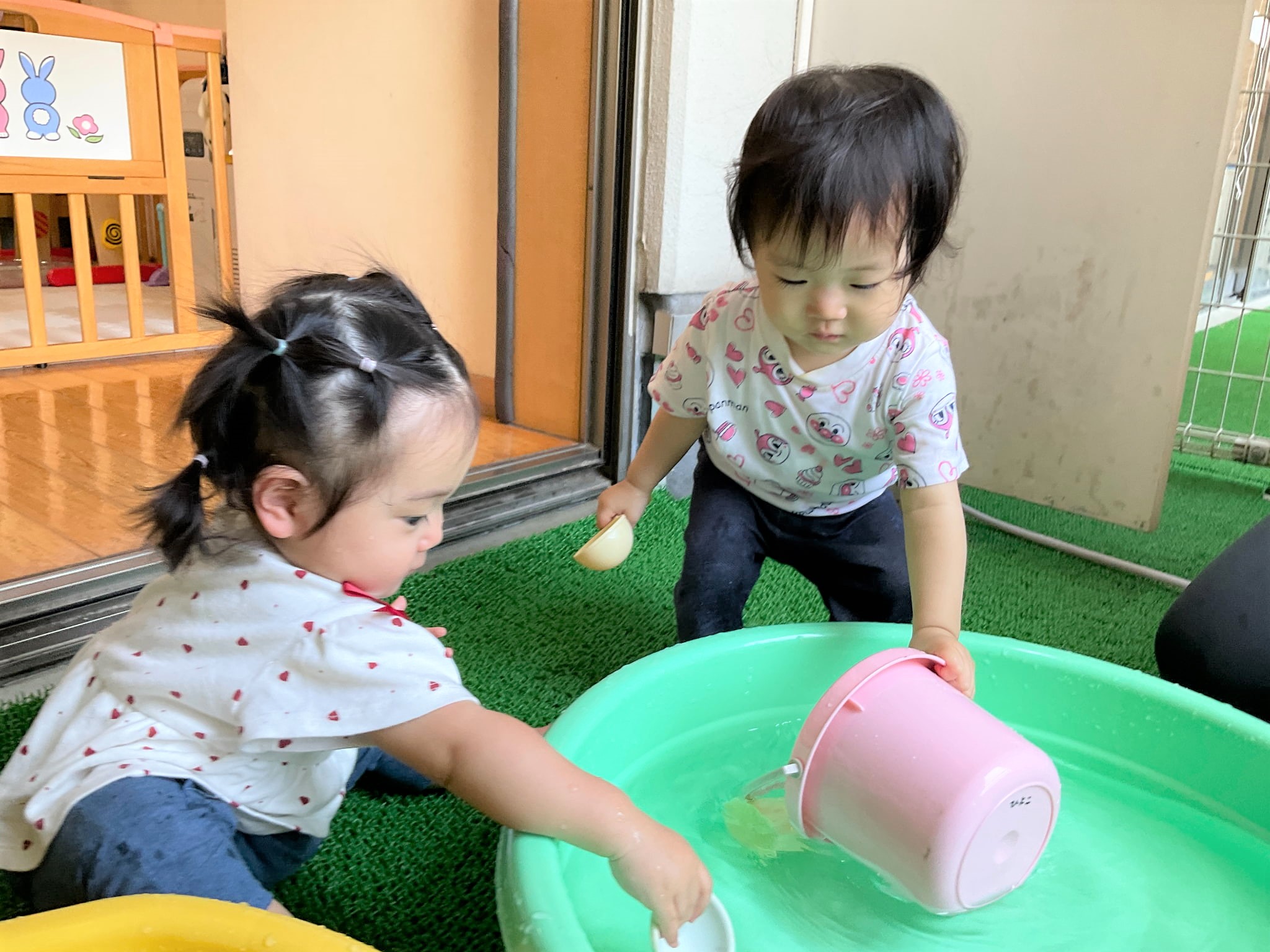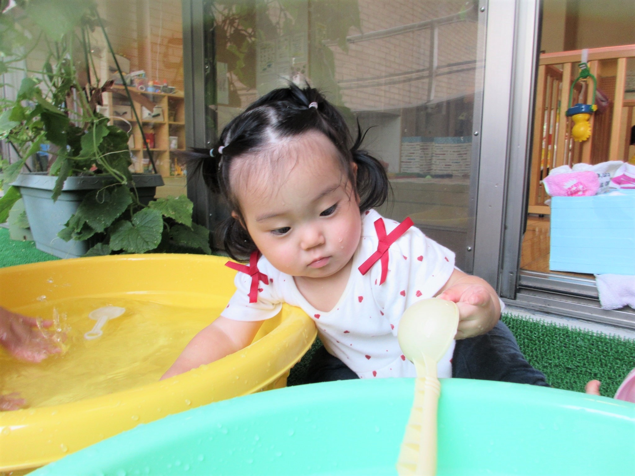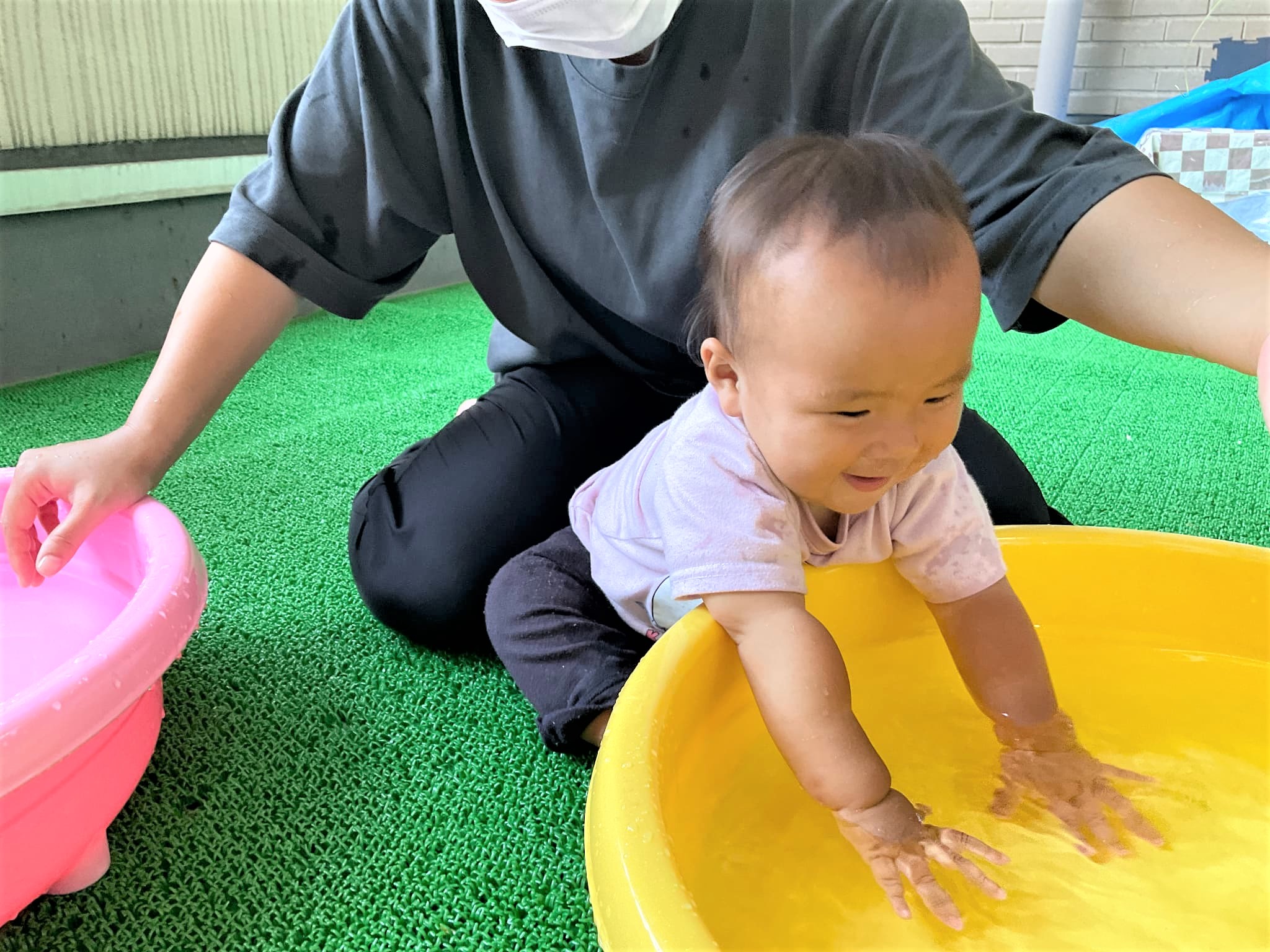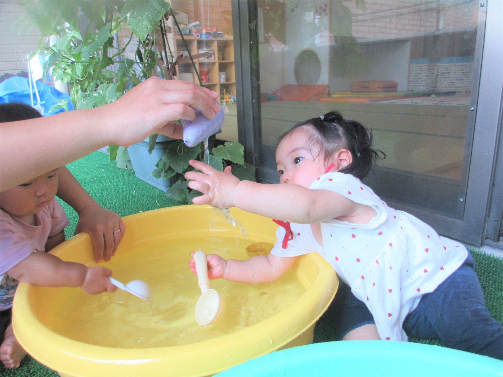 そこから、ひよこ組の部屋をふと見ると、水遊びをしていたので