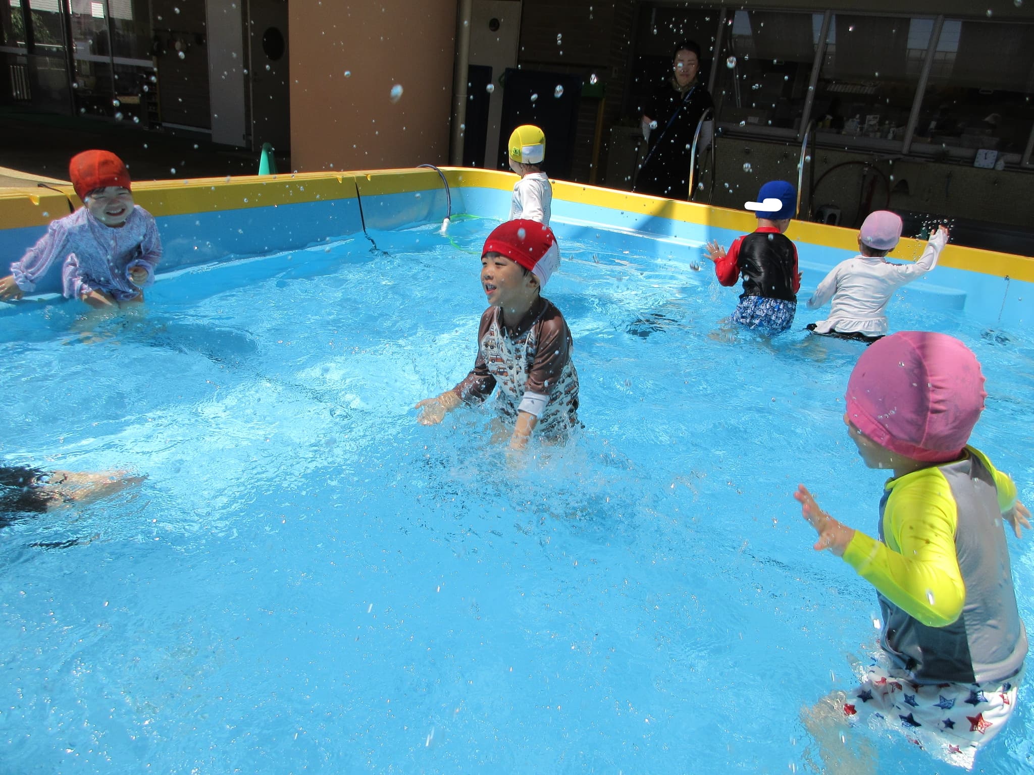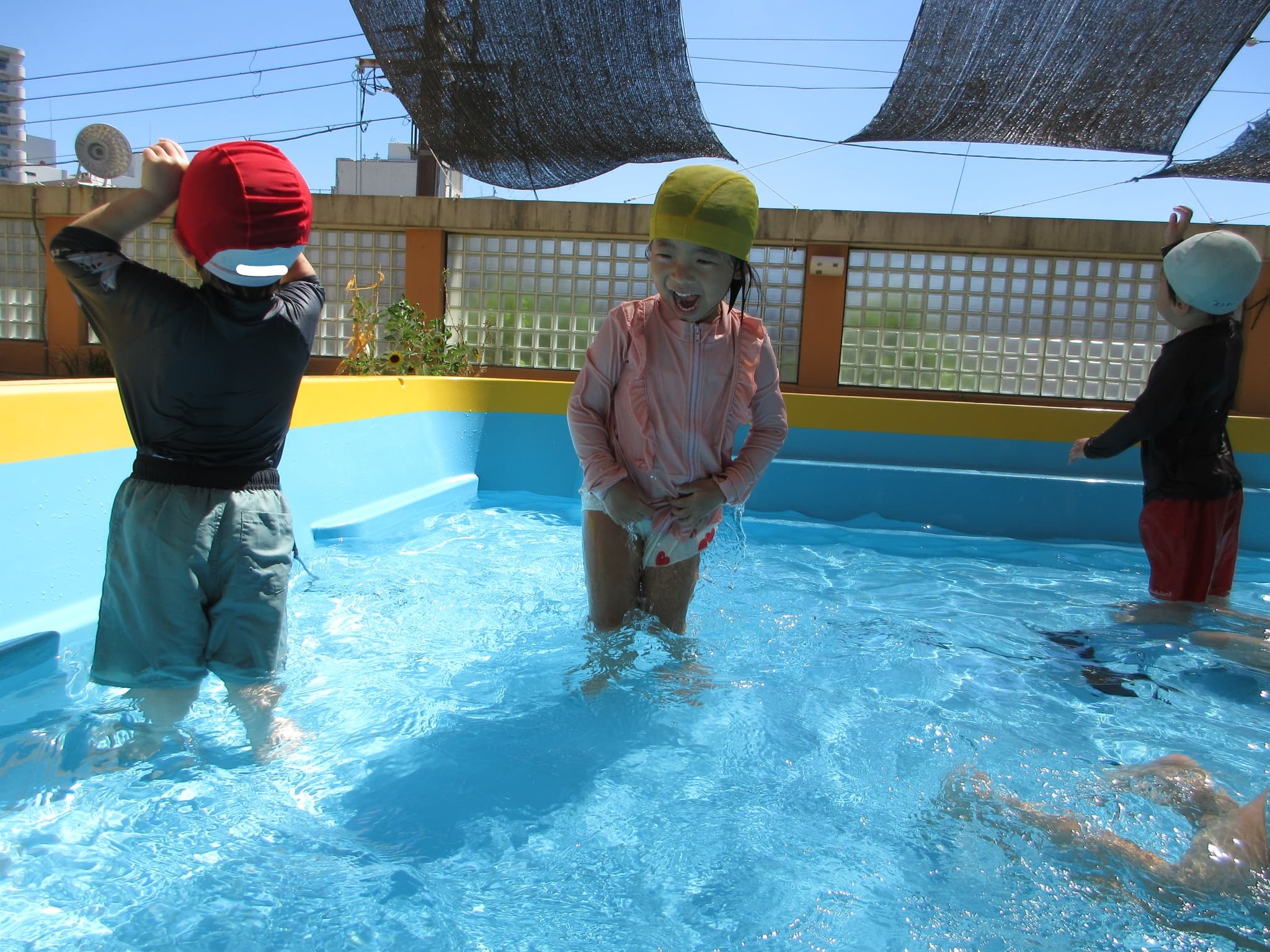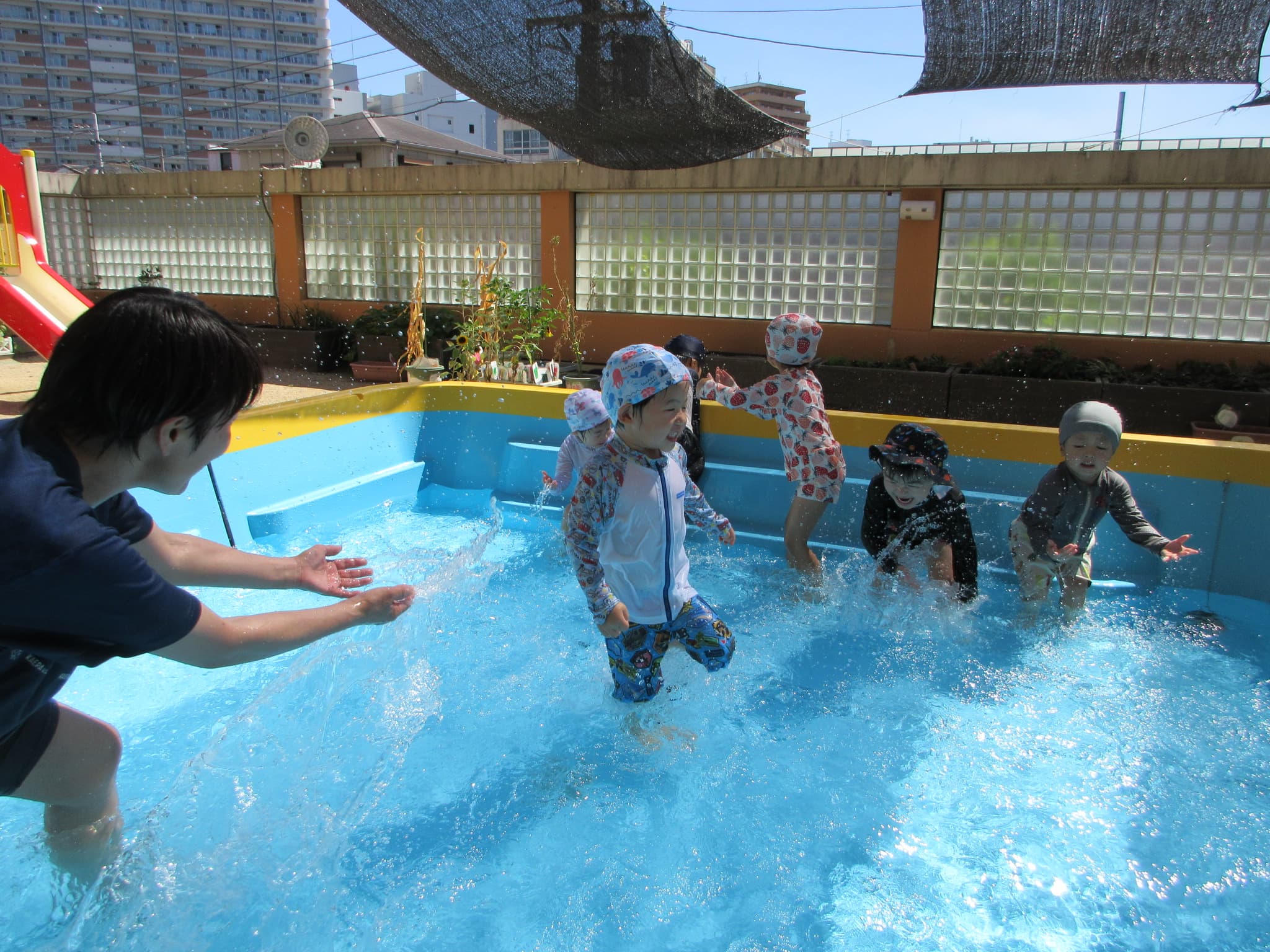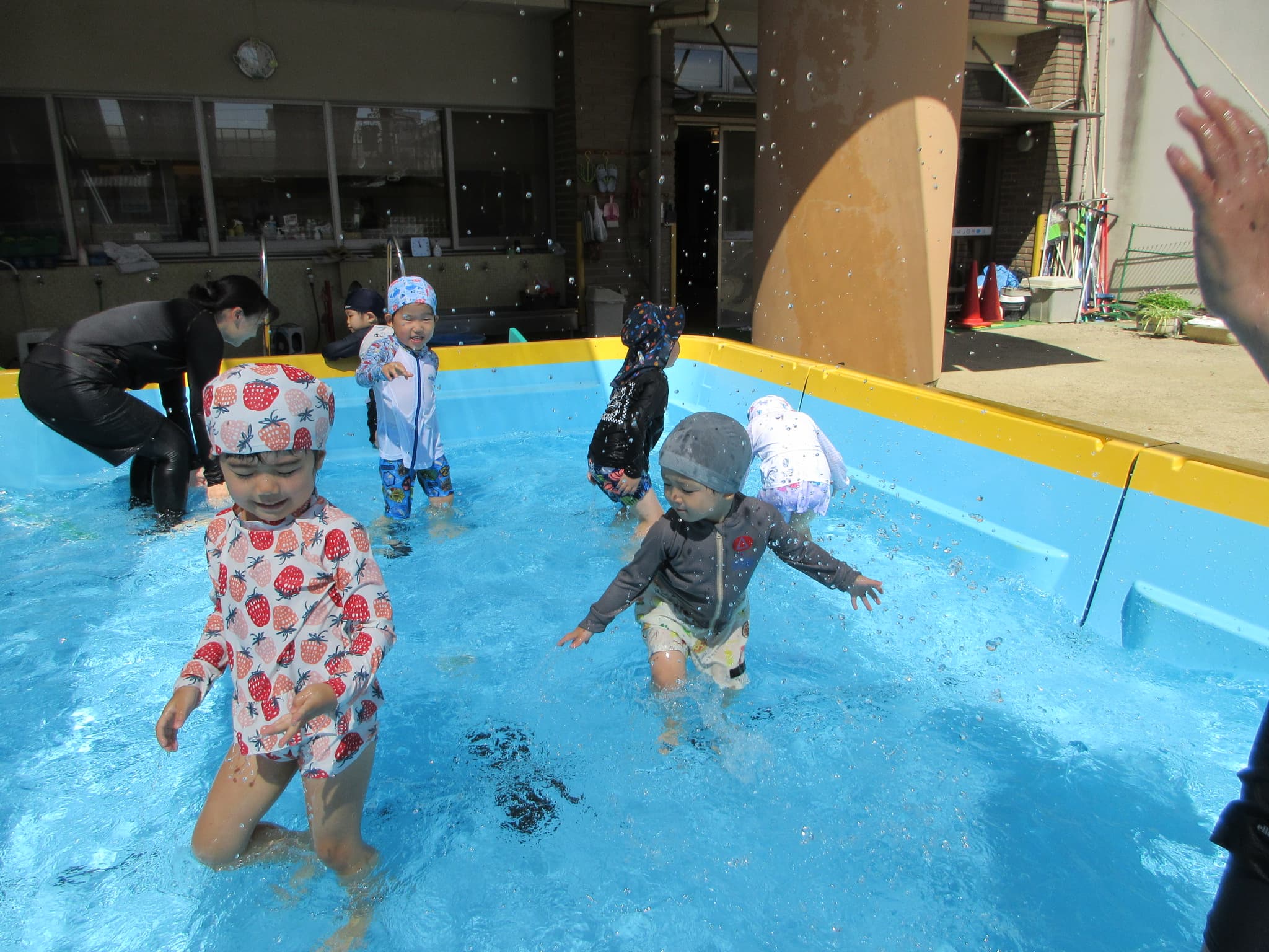 顔に水が掛かることにも少しずつ少しずつ慣れてきた、ぱんだ組の子どもたち・・・