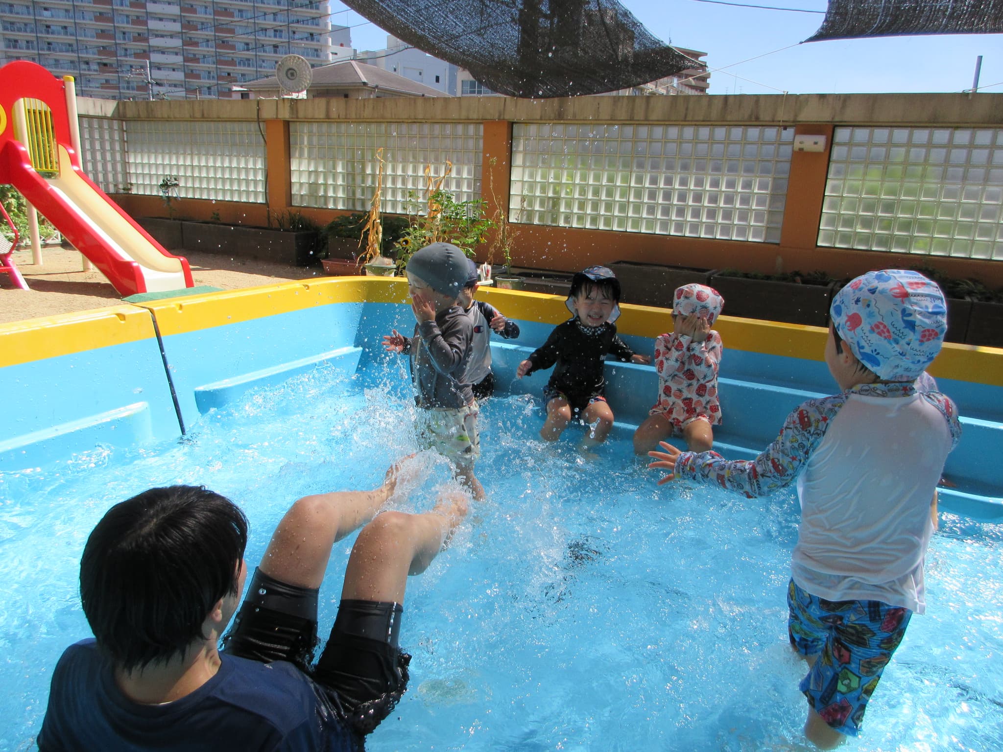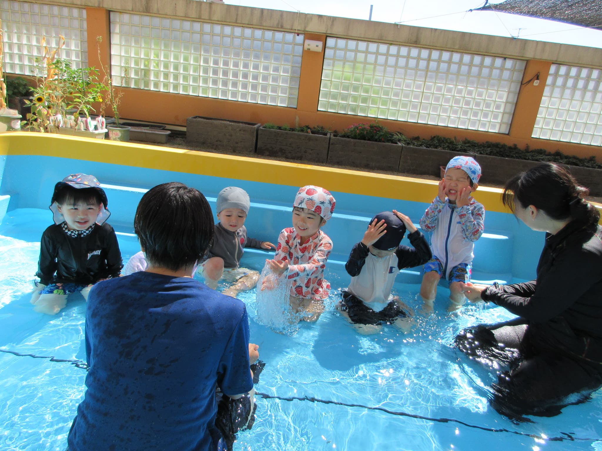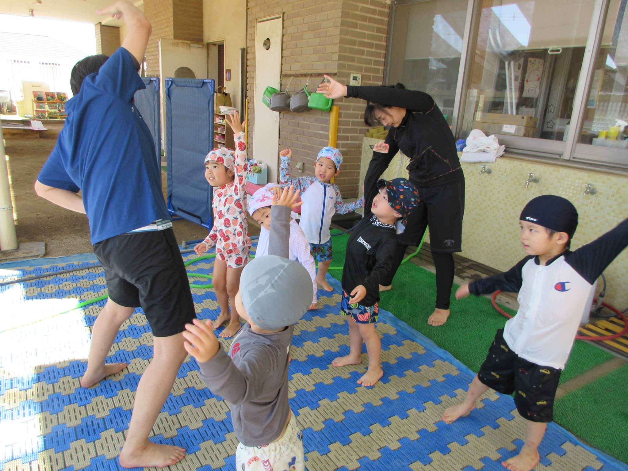 顔に水が掛かることにも少しずつ少しずつ慣れてきた、ぱんだ組の子どもたち・・・