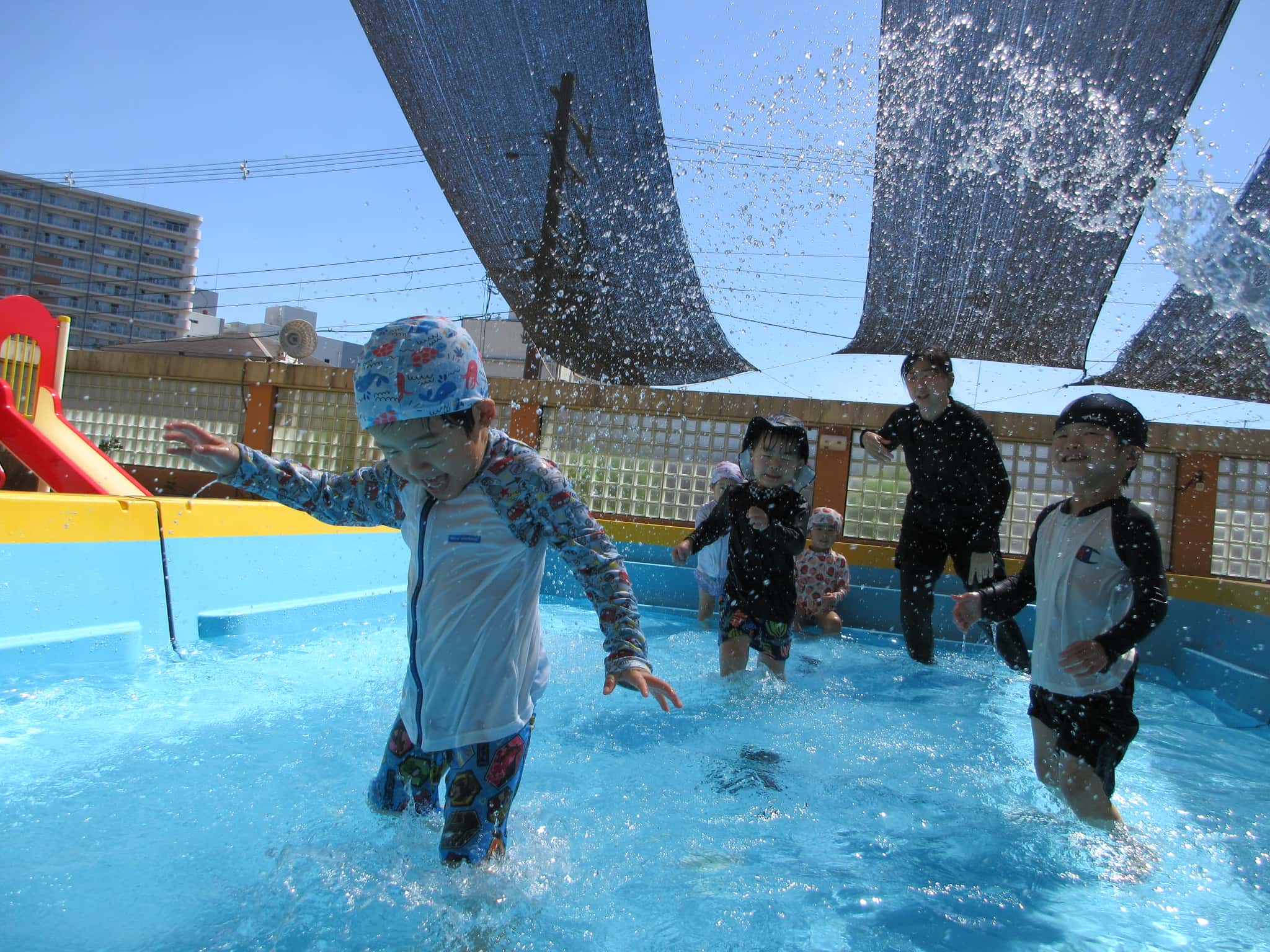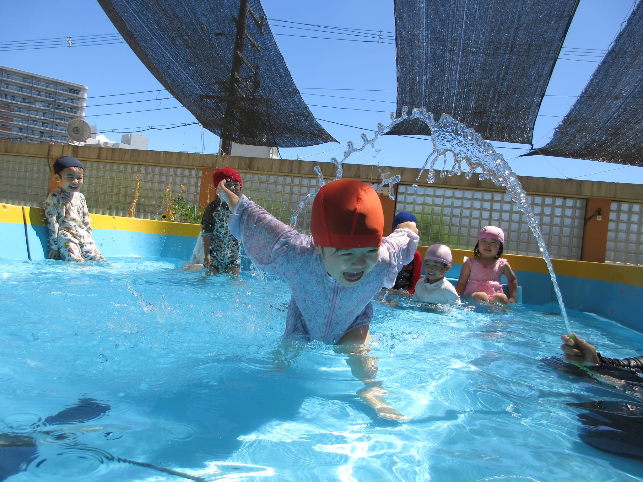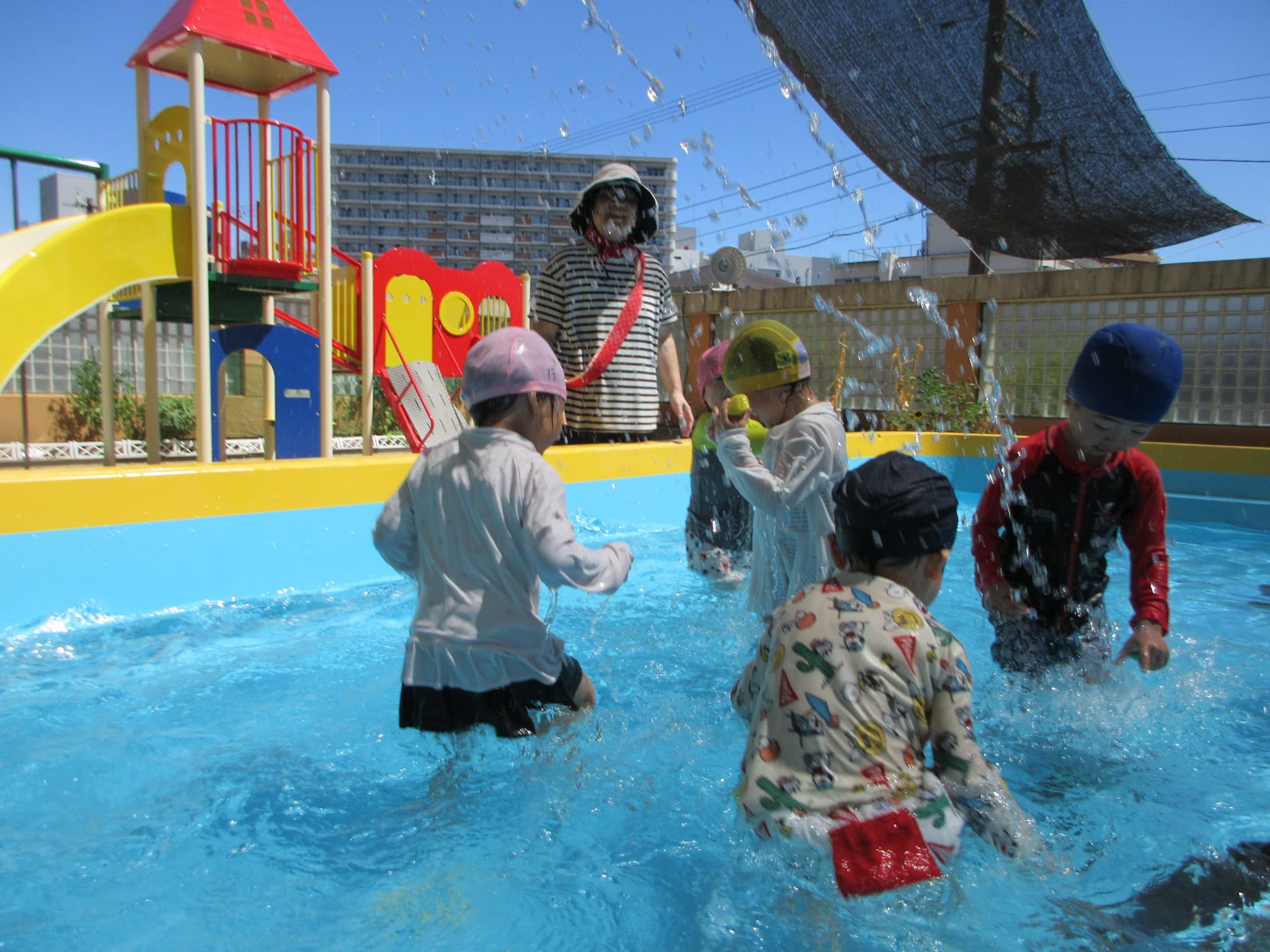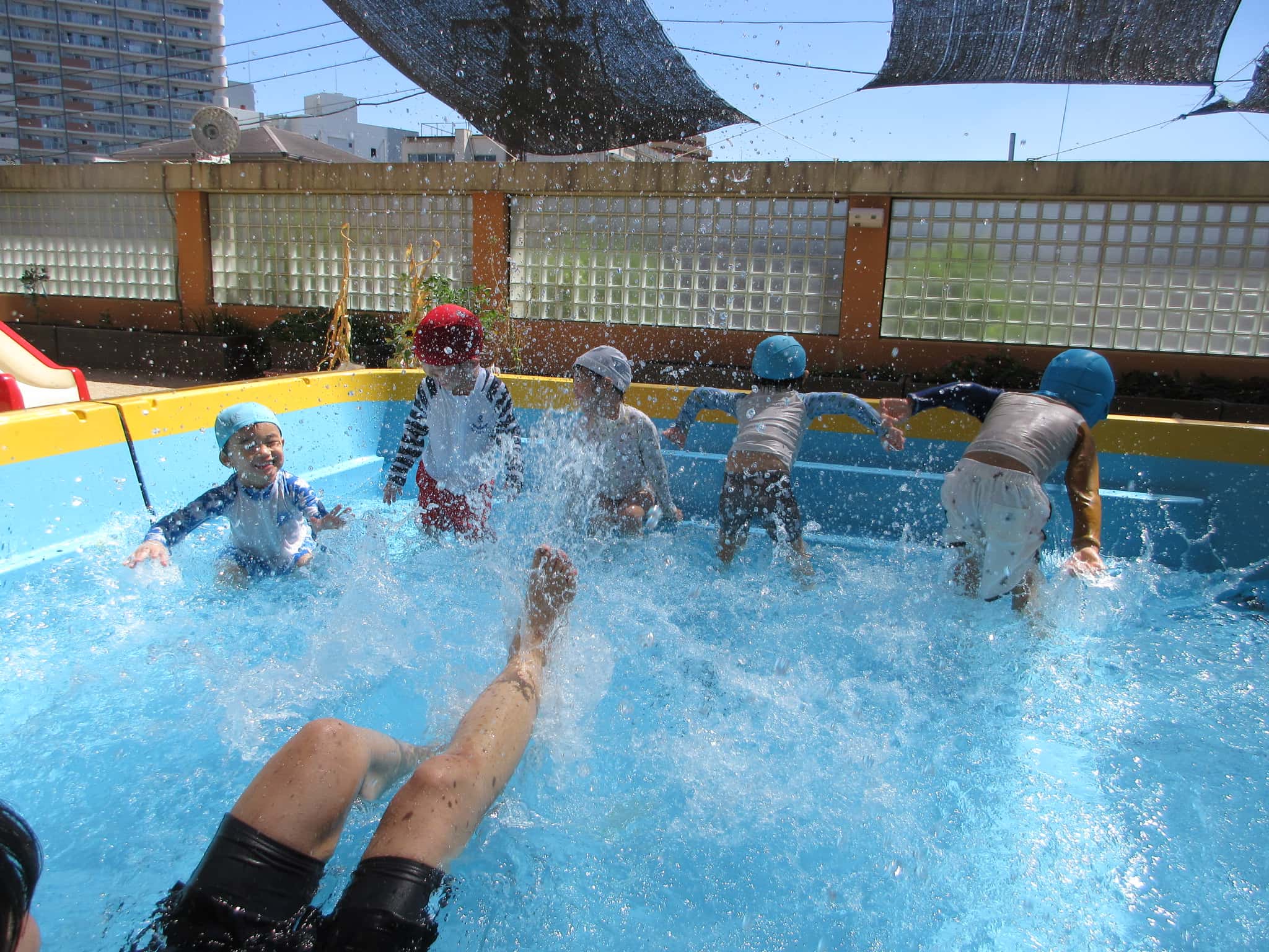 顔に水が掛かることにも少しずつ少しずつ慣れてきた、ぱんだ組の子どもたち・・・