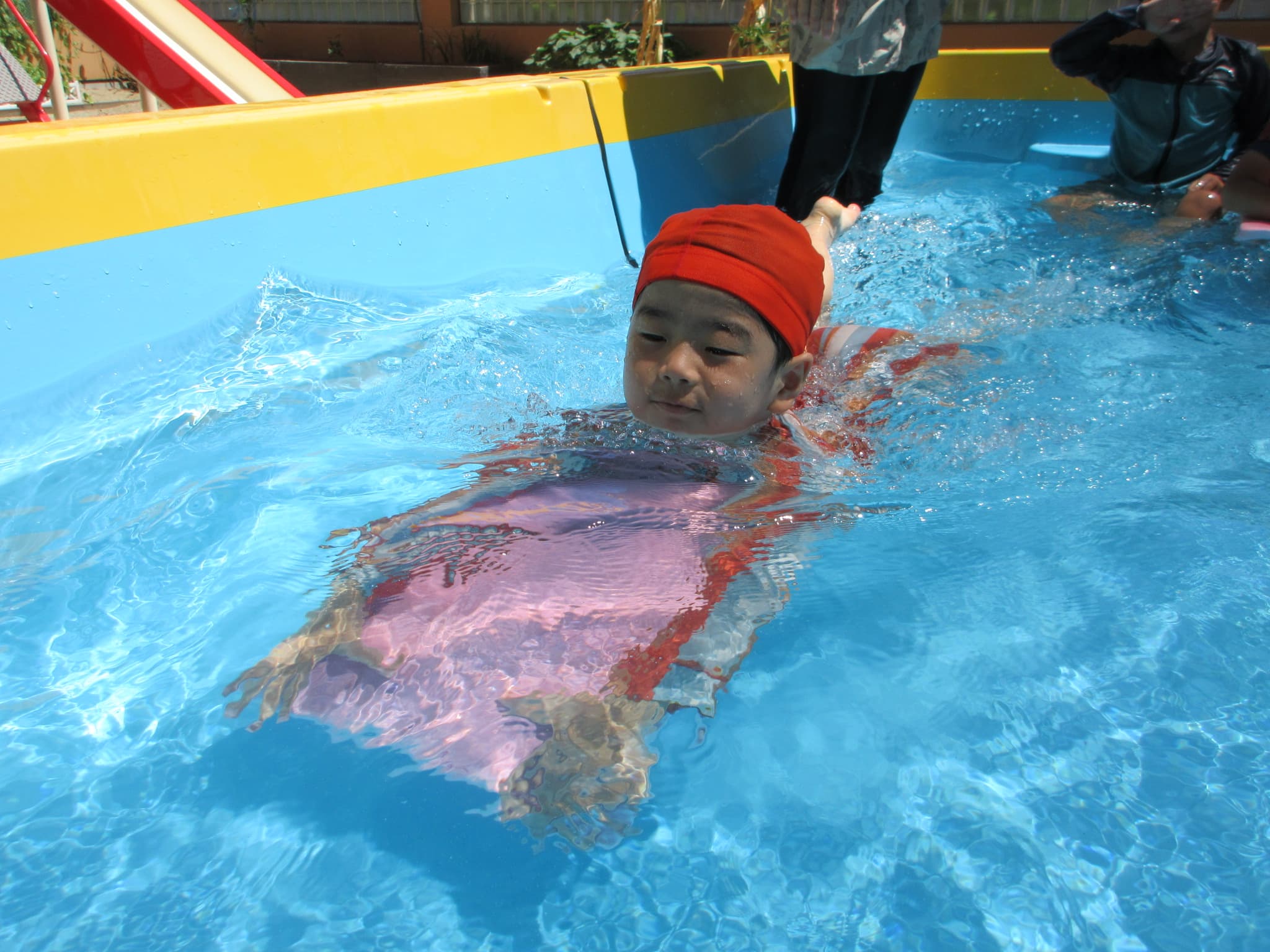 今年は、先生に見守られながら自分のペースで水に慣れてきて