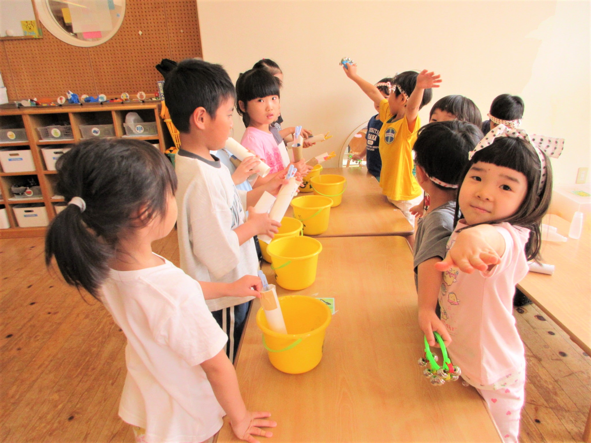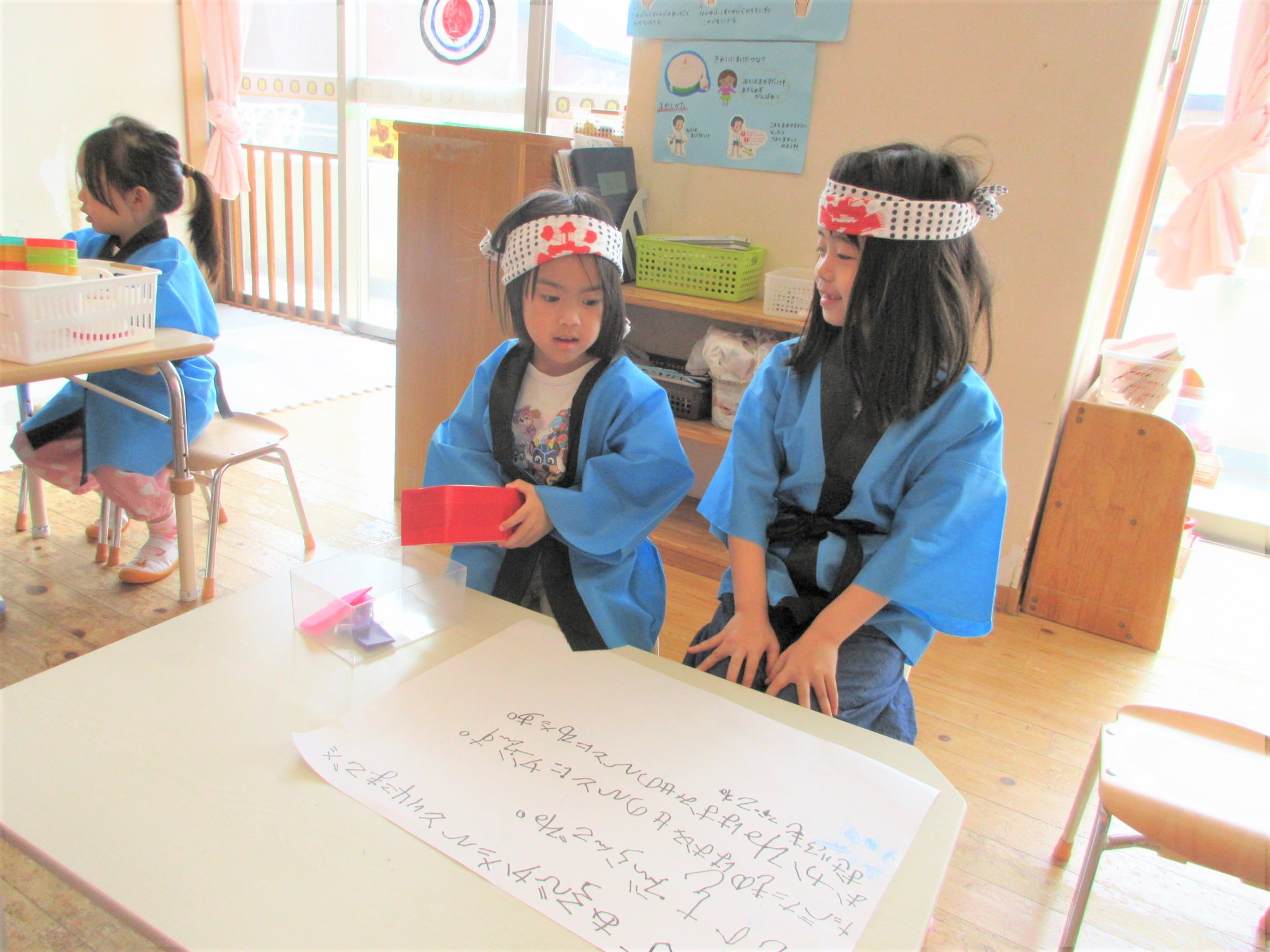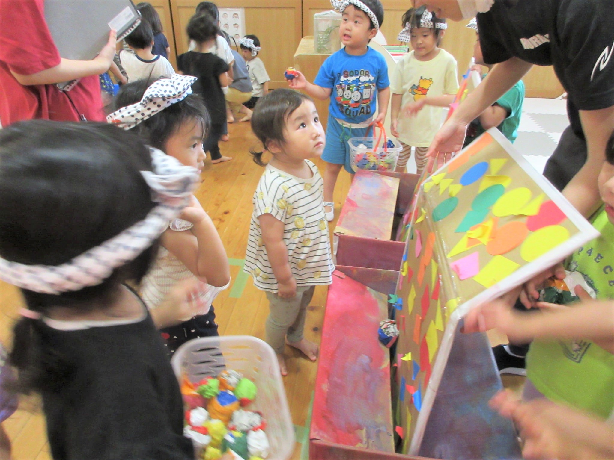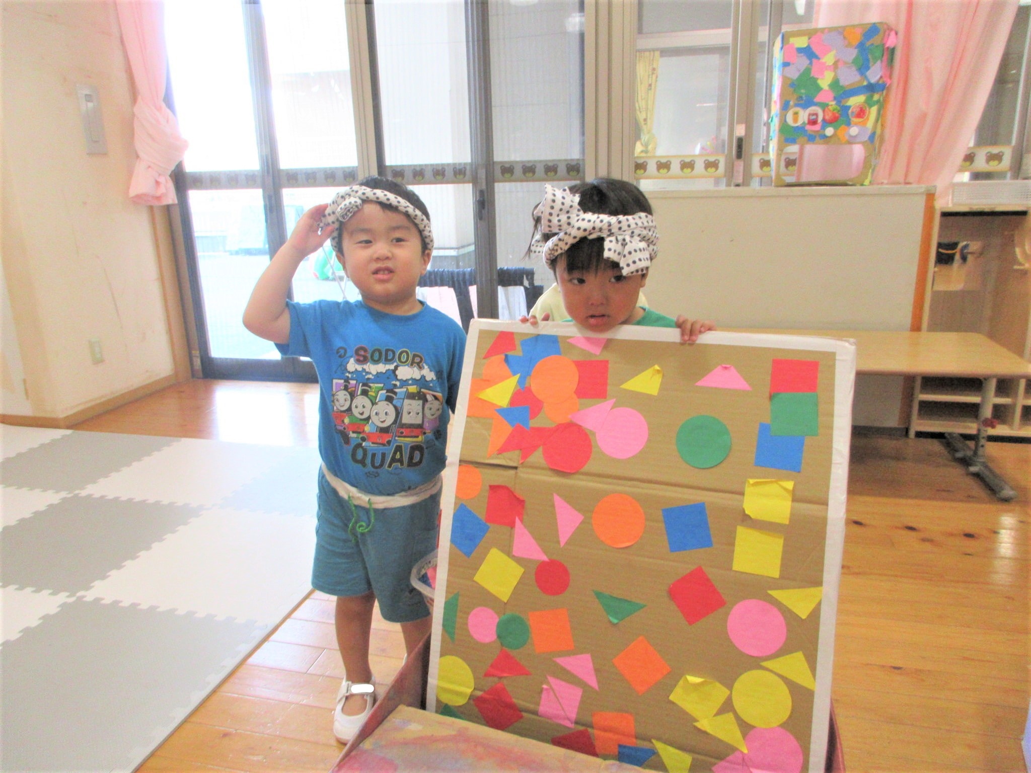 らいおん組の子どもたちが作った手裏剣を的に入れる遊びです♪