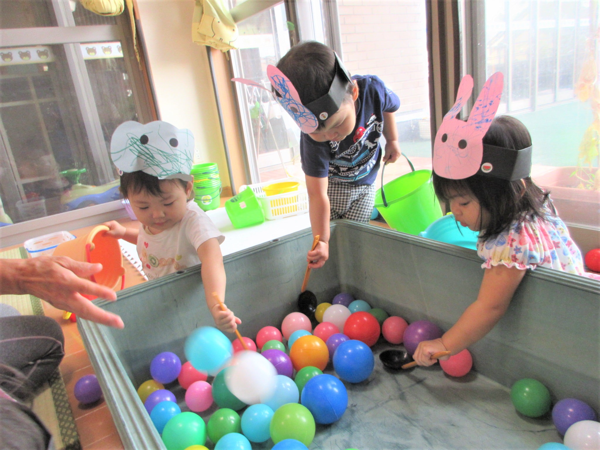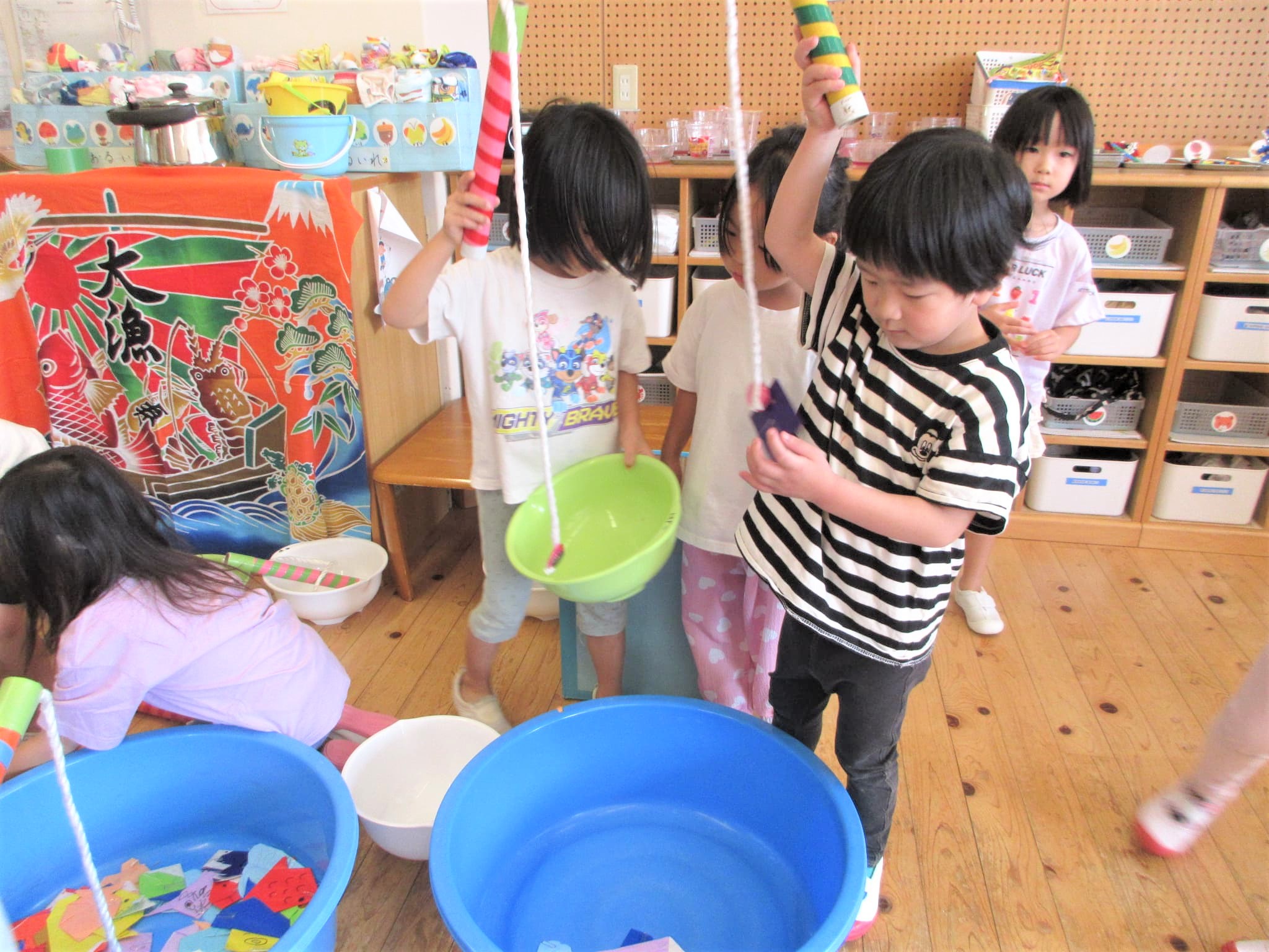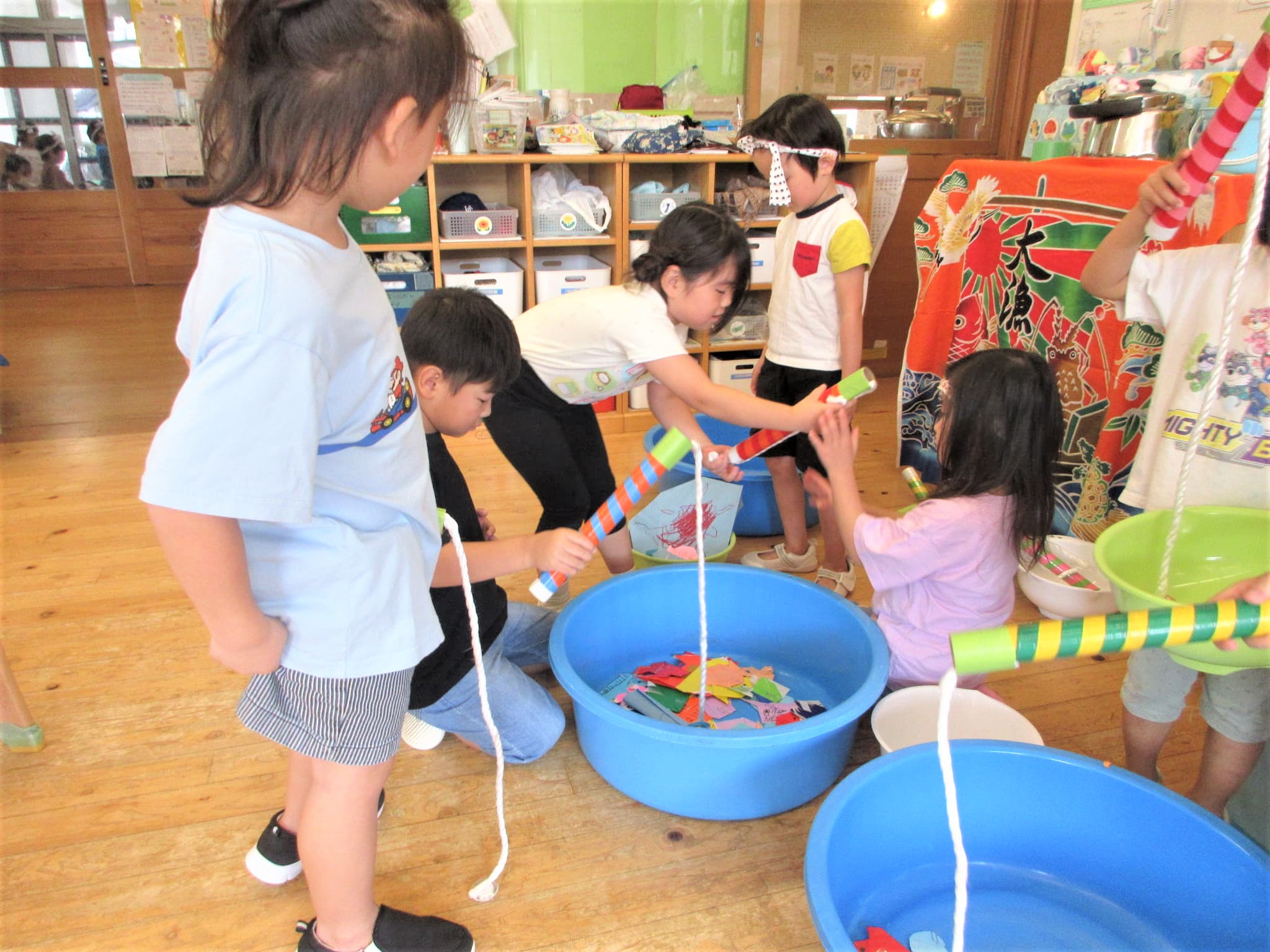 うさぎ組の子どもたちがヨーヨーを釣りやすくなるように