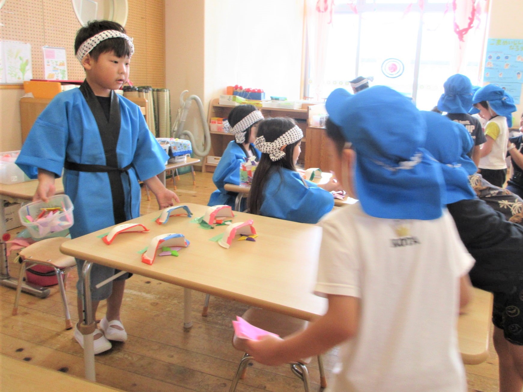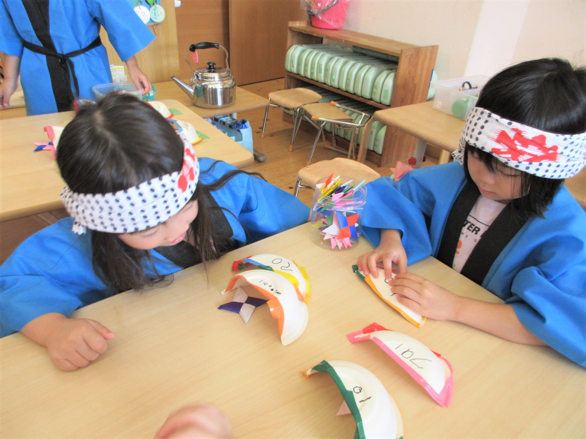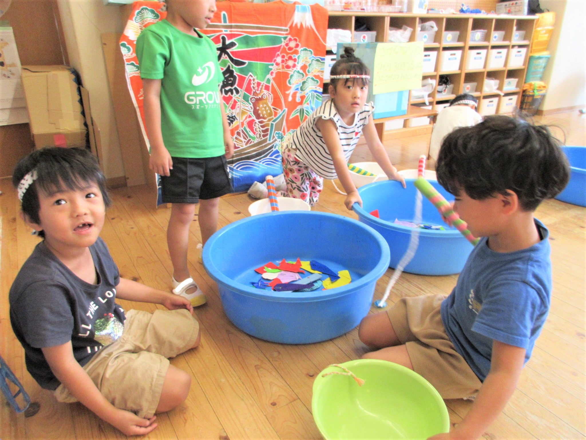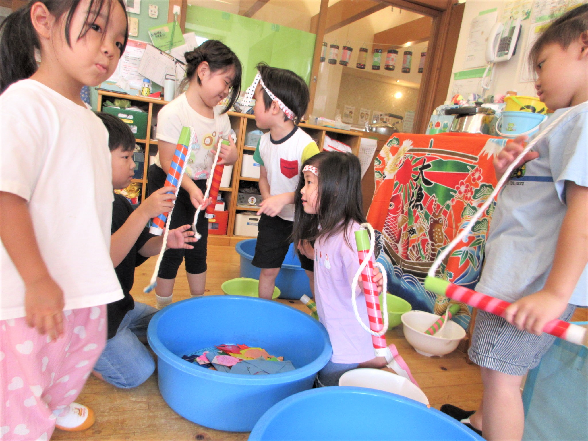 うさぎ組の子どもたちがヨーヨーを釣りやすくなるように