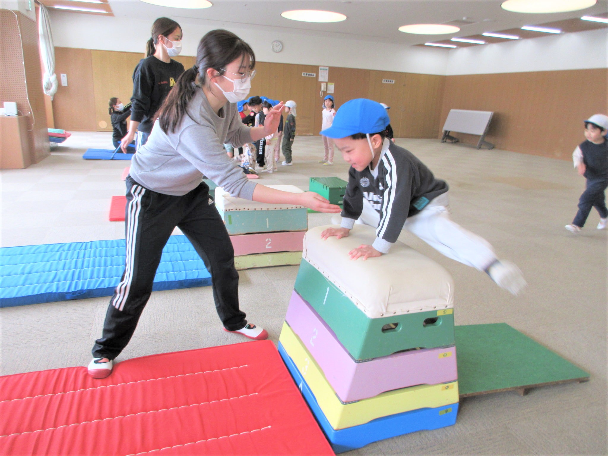 「ベルキンダーには、5段の跳び箱もあるんやで~♪」と言うと