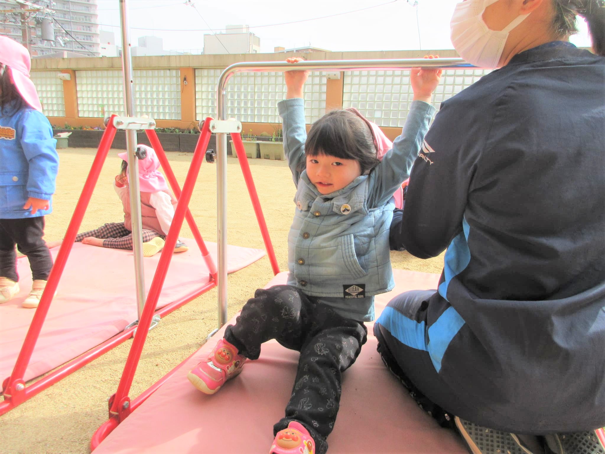「じぶんで やる!」と、自ら鉄棒を握ろうとする姿が見られました♪