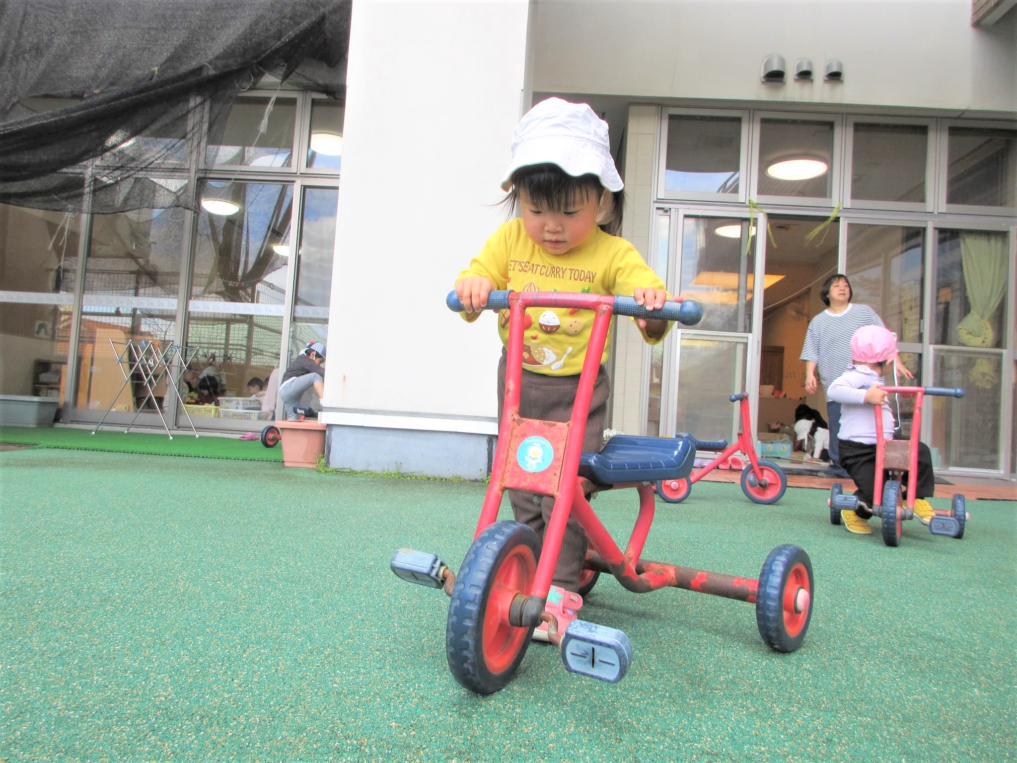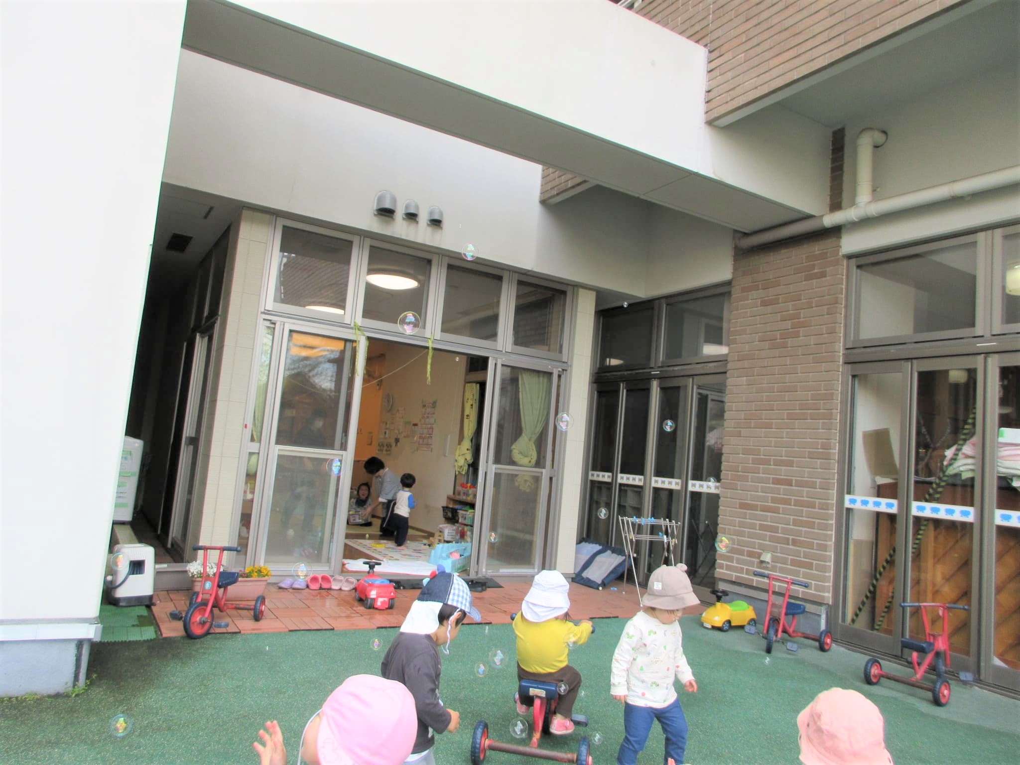 前日の雨で、水たまりが多くて園庭が使えなかったので、今日は中庭で遊んでいました♪