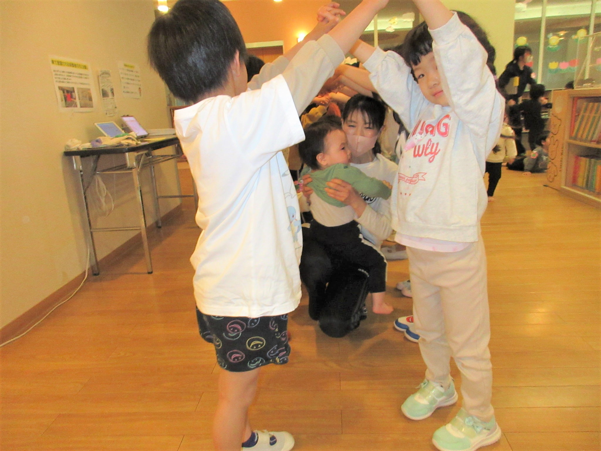 らいおん組に子どもたちにトンネルをつくってもらい、異年齢が通ることができるようにしてくれました♪