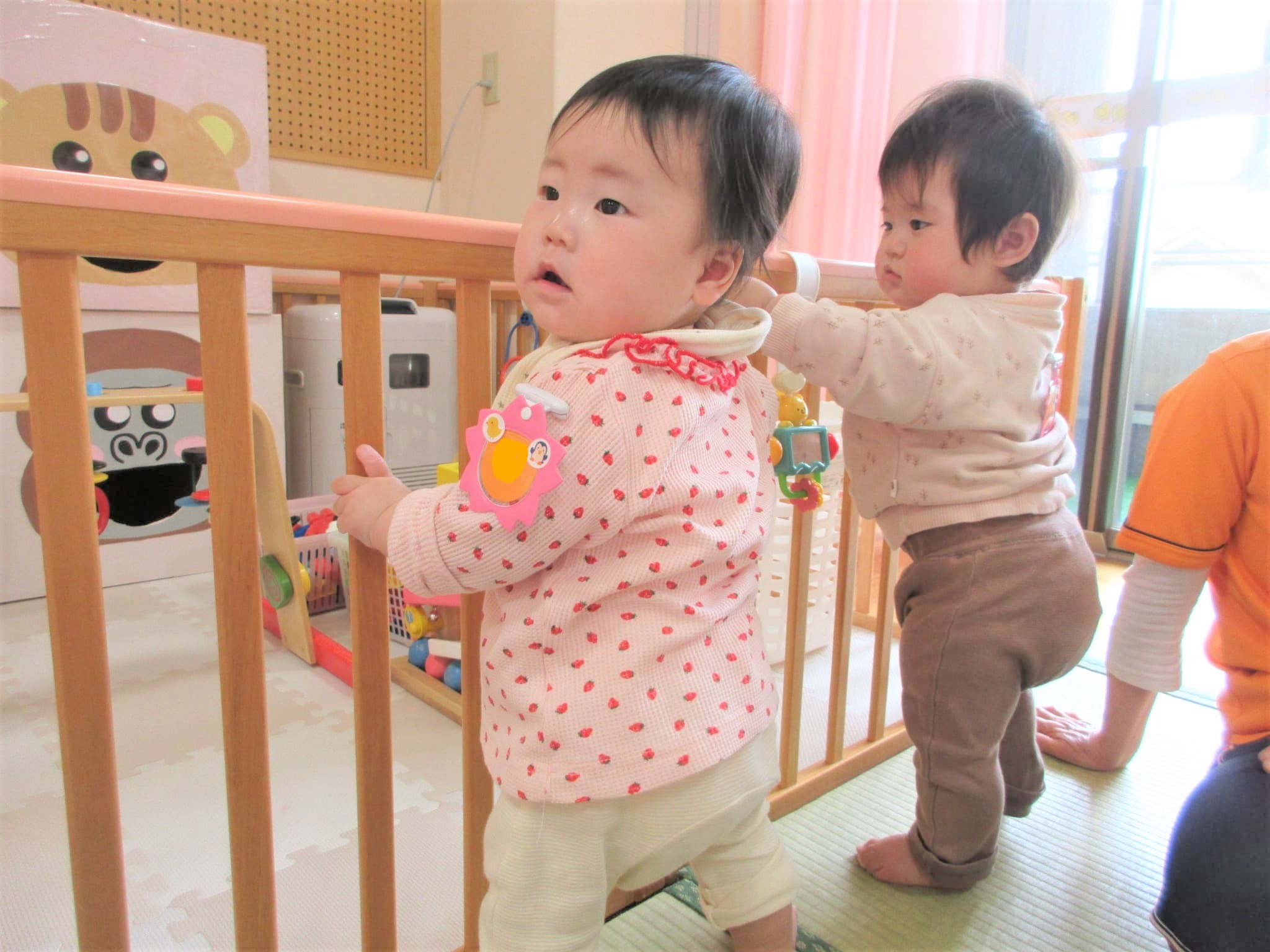 つかまり立ちをしながら見つめ合っている二人の後ろ姿が・・・何とも言えません(*^^*)