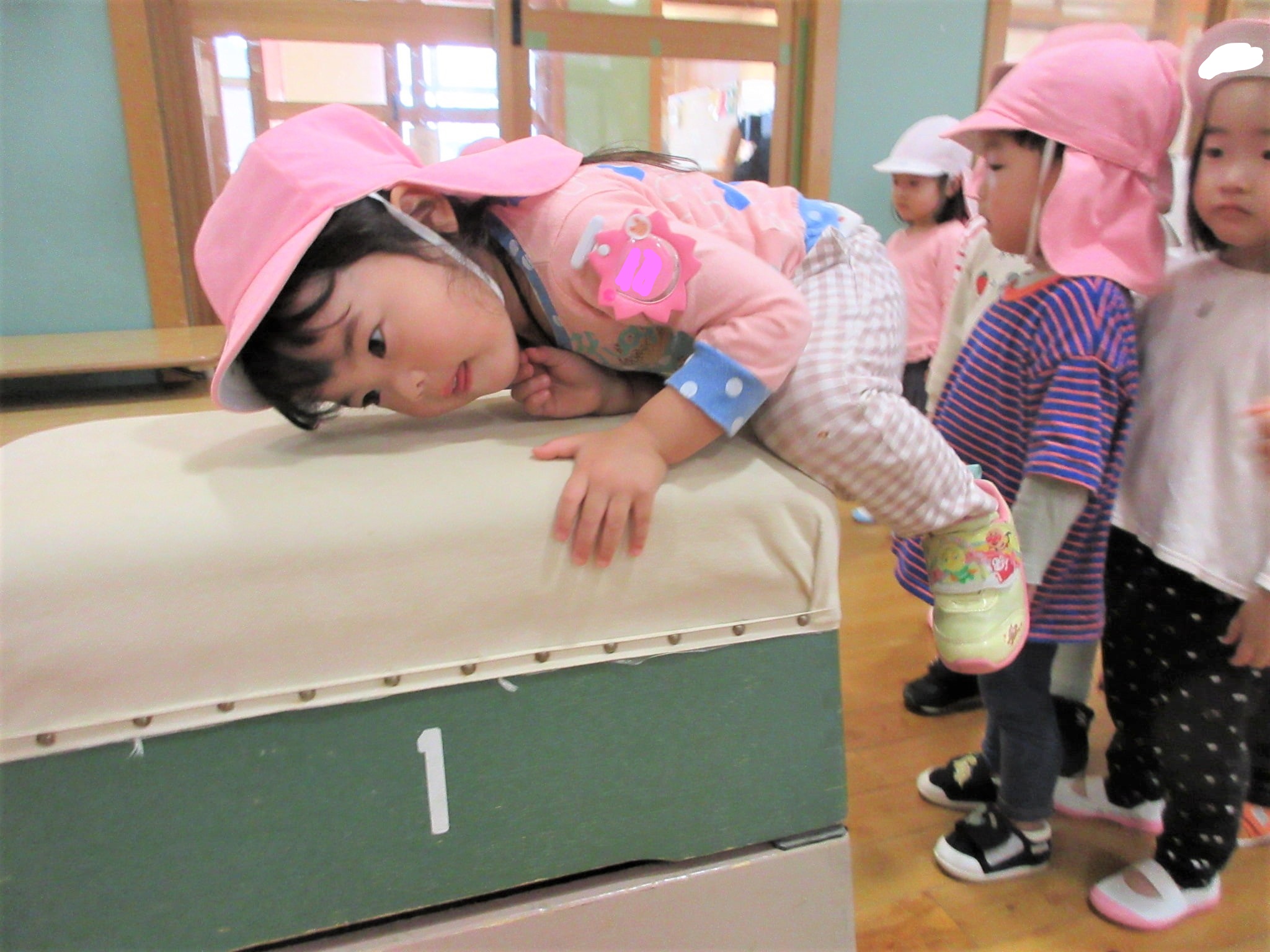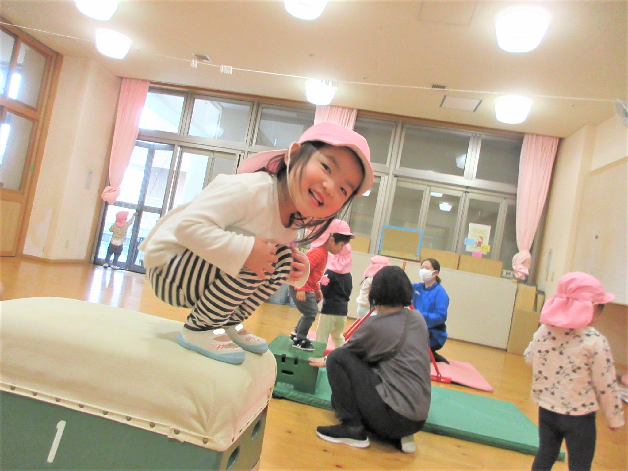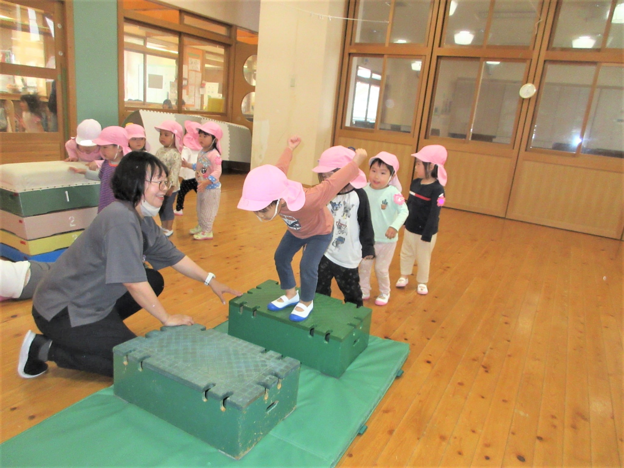 体操の先生に巧技台を置いてもらって、担任の見守りから“この通り(笑)”