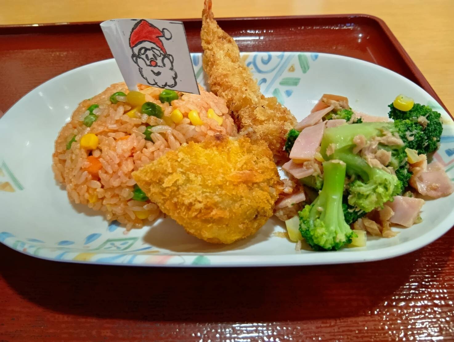 コロッケ、エビフライ、粕汁もあり「豪華やね!」「美味しいわ♪」と皆さんに好評でした。